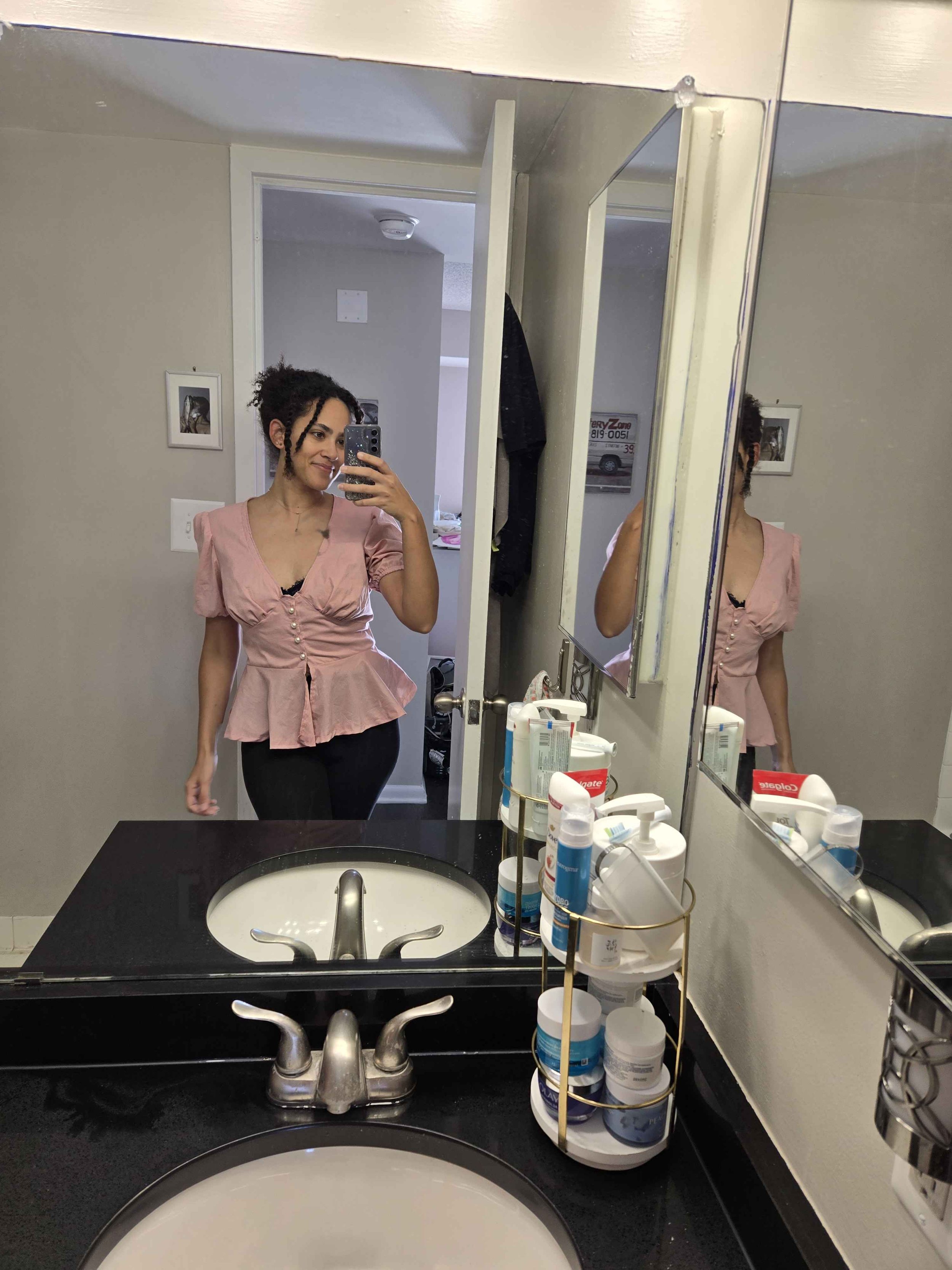 My blouse is officially done, and I am absolutely in love with it! As I was working on the mockup, I ordered the fabric, which is a dusty pink Egyptian cotton fabric with a beautiful drape. I also got a 12-pack of vintage pearl shank buttons (½”) from Etsy. The blouse is a mini-Frankenstein from two different patterns. I attempted to make the flare from other patterns, but they were not working. Instead, I had to bite the bullet and do geometry, which, unfortunately, was the answer. Math has always been my weakest skill (I got a 19 on my ACT math section [the science section saved me]). In the end, I ended up grabbing another pattern with a peplum and stealing it.